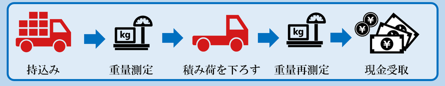 ※持ち込み---->重量測定---->積立荷を下ろす---->重量再測定---->現金受取